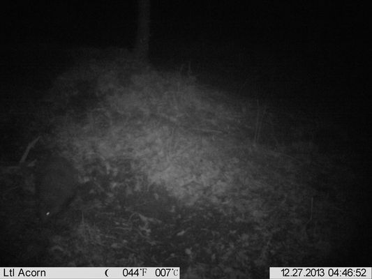A very wild night indeed: cold (1 degree or so) and very windy. Very little sign of the badgers, apart from one rear view of one walking back to the sett at 2:18 and another walking into the woods,and not returning, apparently, at 3:16. Two dishes were refilled but only one was found and that wasn't finished.