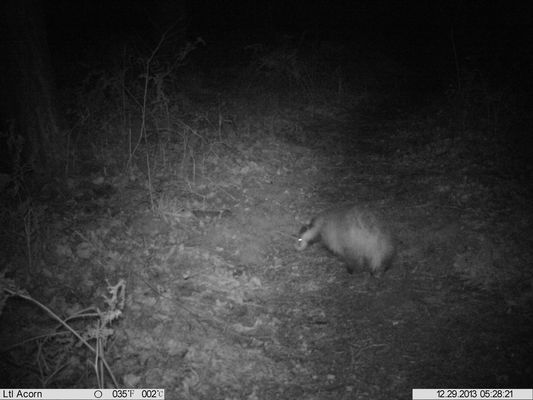 The overnight videos showed the badgers were out from 23:27 at least and they seemed very relaxed. It was cold but not freezing and fairly dry. They made brief trips into the wood, one for 35 another for 13 minutes, between midnight and 2:30. One passed a camera at a trot at 03:49. Another, at a more leisurely pace at a surprisingly late 05:28 (new record?); Benji at a guess -- he's a bit of a dawdler.