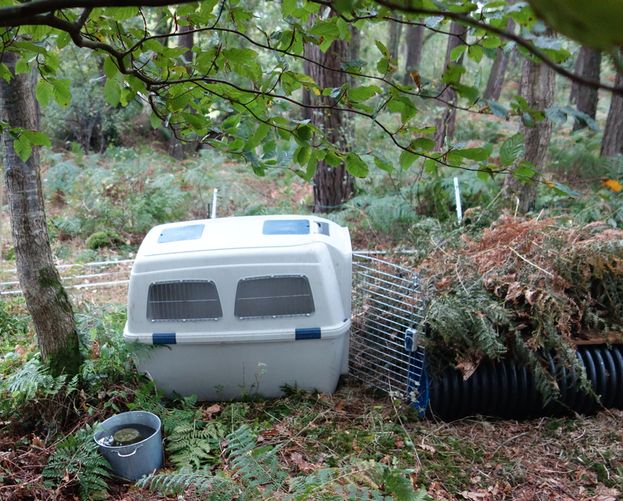 The badgers left their crate, explored their new surroundings and then retired underground. Previously they'd lived for some months in a small grass paddock, about half the size of their new enclosure, with a wire fence around it. Their old home was a den under some logs. As they're nocturnal they'd been seen only rarely and were quite wild, despite having been hand-reared.