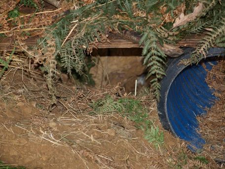 Entrance to a new sett, possibly an old fox earth, covered with a board and some vegetation. The pipe came from their old enclosure and should have been familiar. Dung from their old latrines was placed in the new enclosure (badgers use it to mark the boundaries of their territory).</font size>