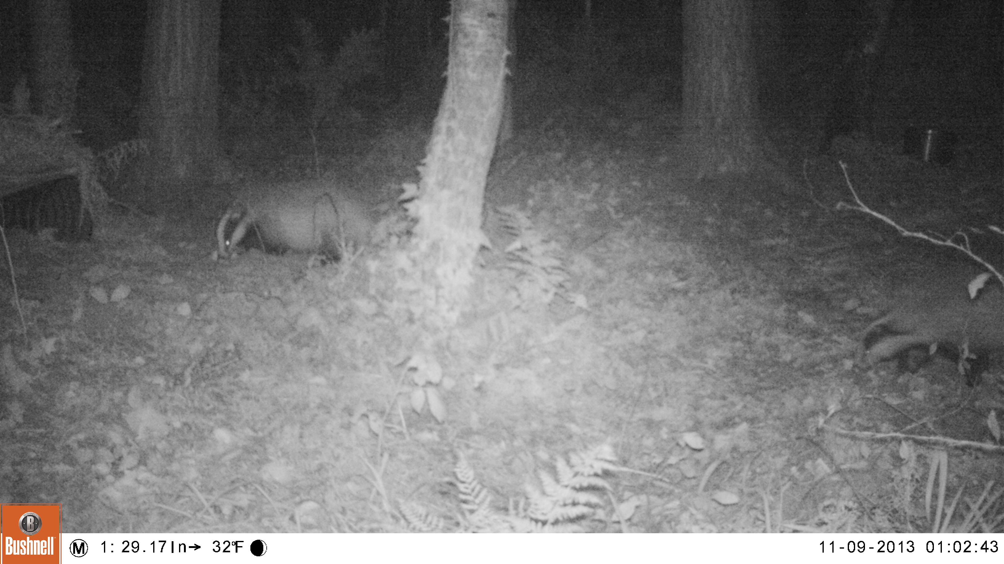 First badger out at 17:45. Quite a lot of activity recorded of bedding being taken in and and out, sometimes within a few minutes. One video of a badger carefully bringing an egg underground.